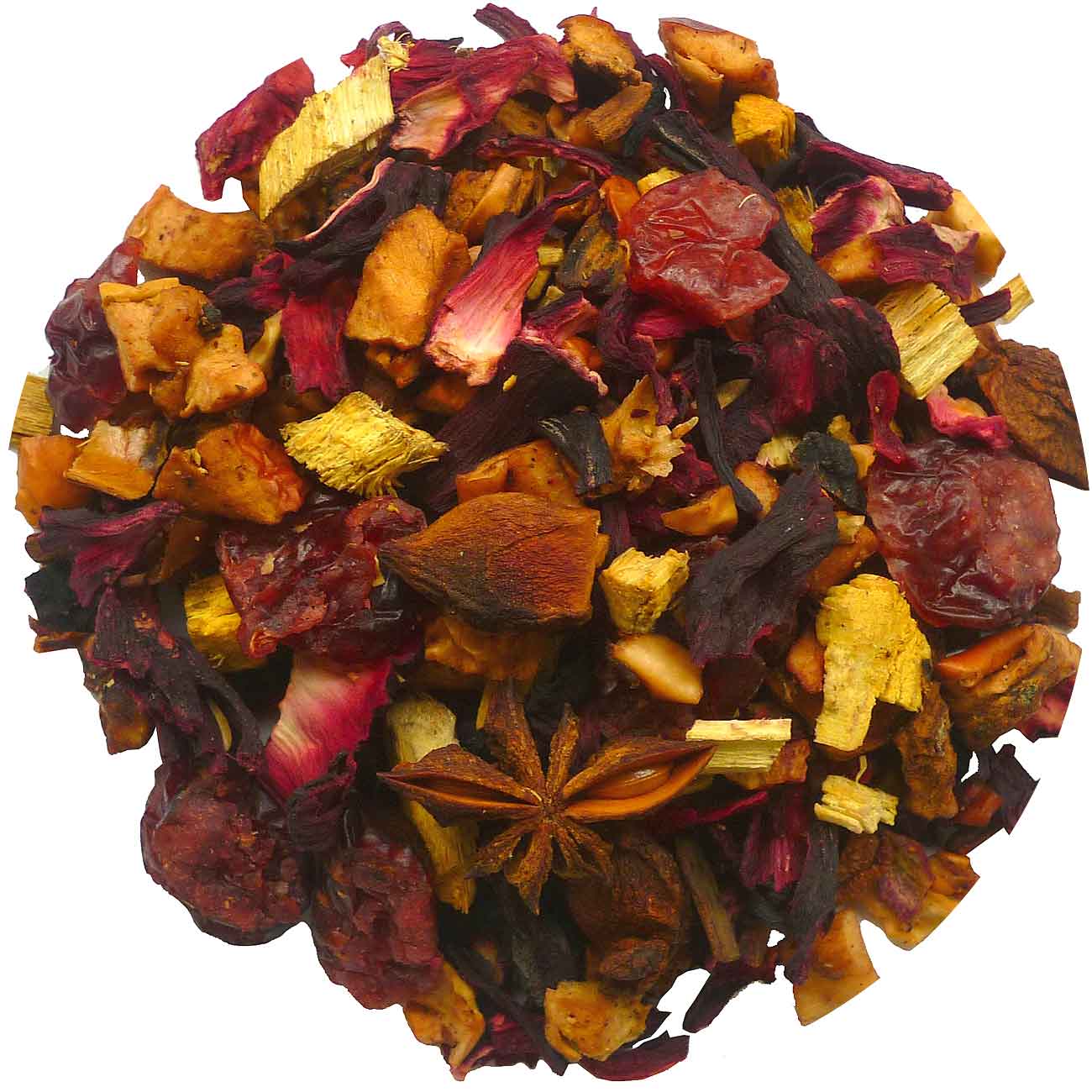 Stukjes appel, hibiscus, veenbessen (veenbessen, suiker, zonnebloemolie), zoethout*, kaneel, steranijs, aroma.